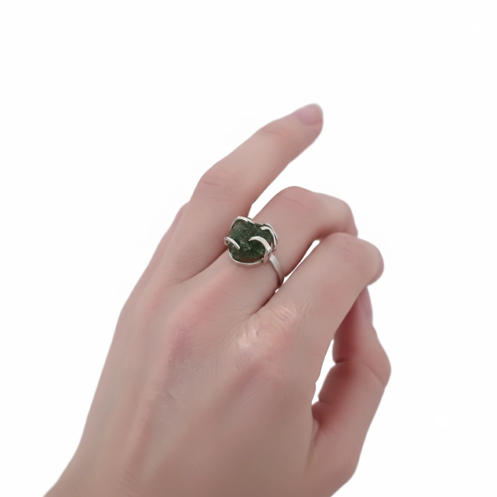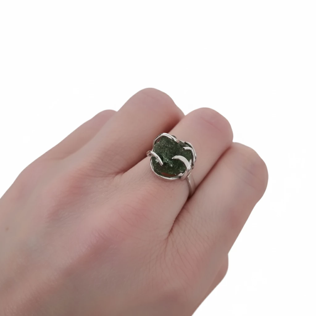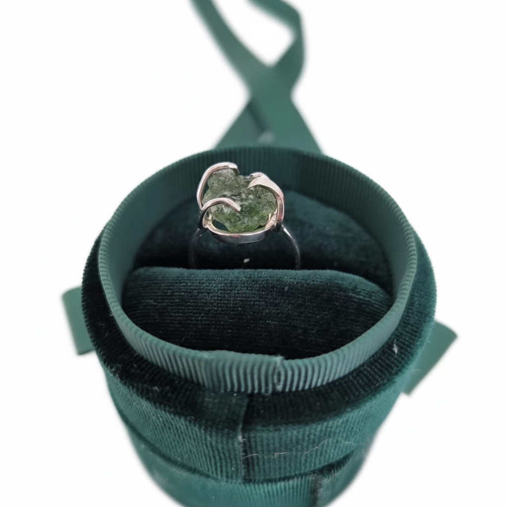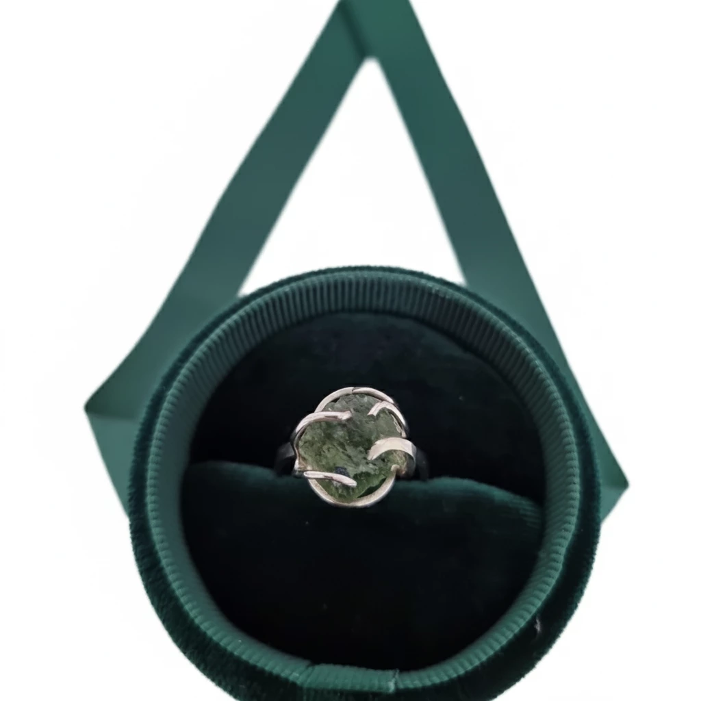 Autorský originální kousek stříbrného prstenu s neopracovaným vltavínem. Kupujete prsten, který je na fotografii.