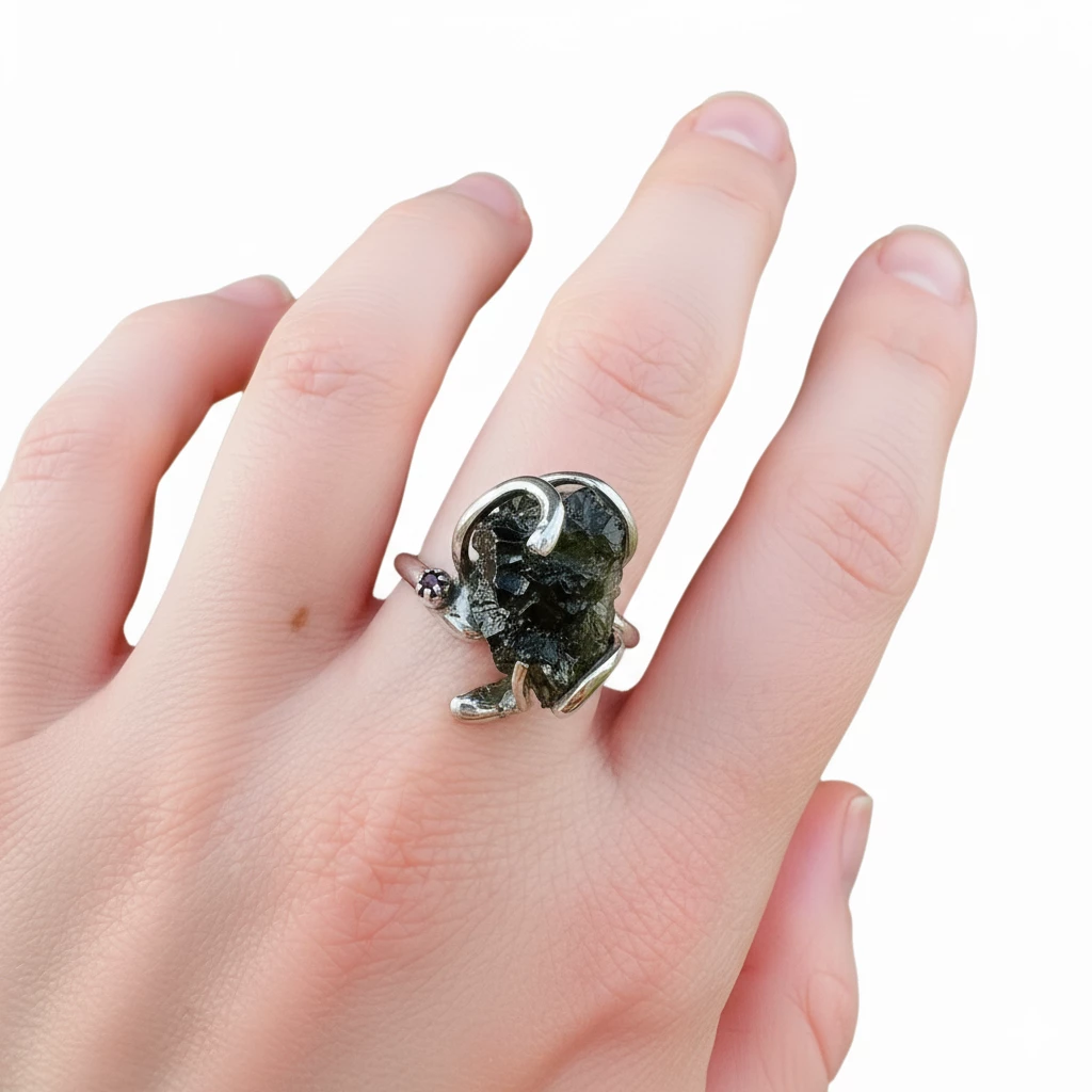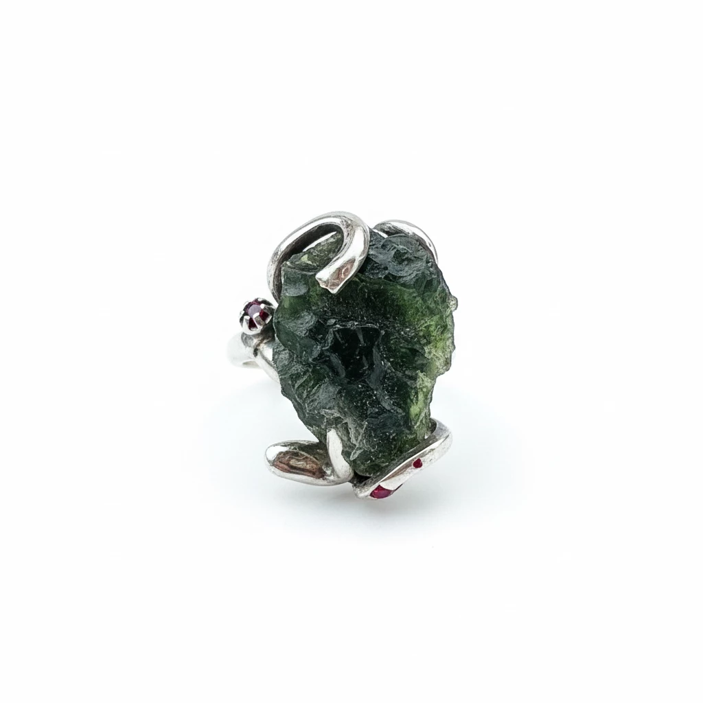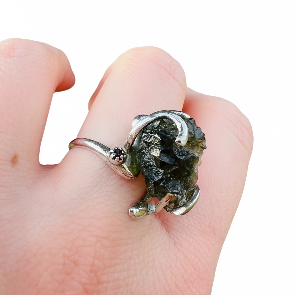 Skvostný unikátní stříbrný prsten se surovým vltavínem, který je nádherně zpracovaný a minimalistickým českým granátem, který prstenu dodá své kouzlo. Jediný kus skladem!
