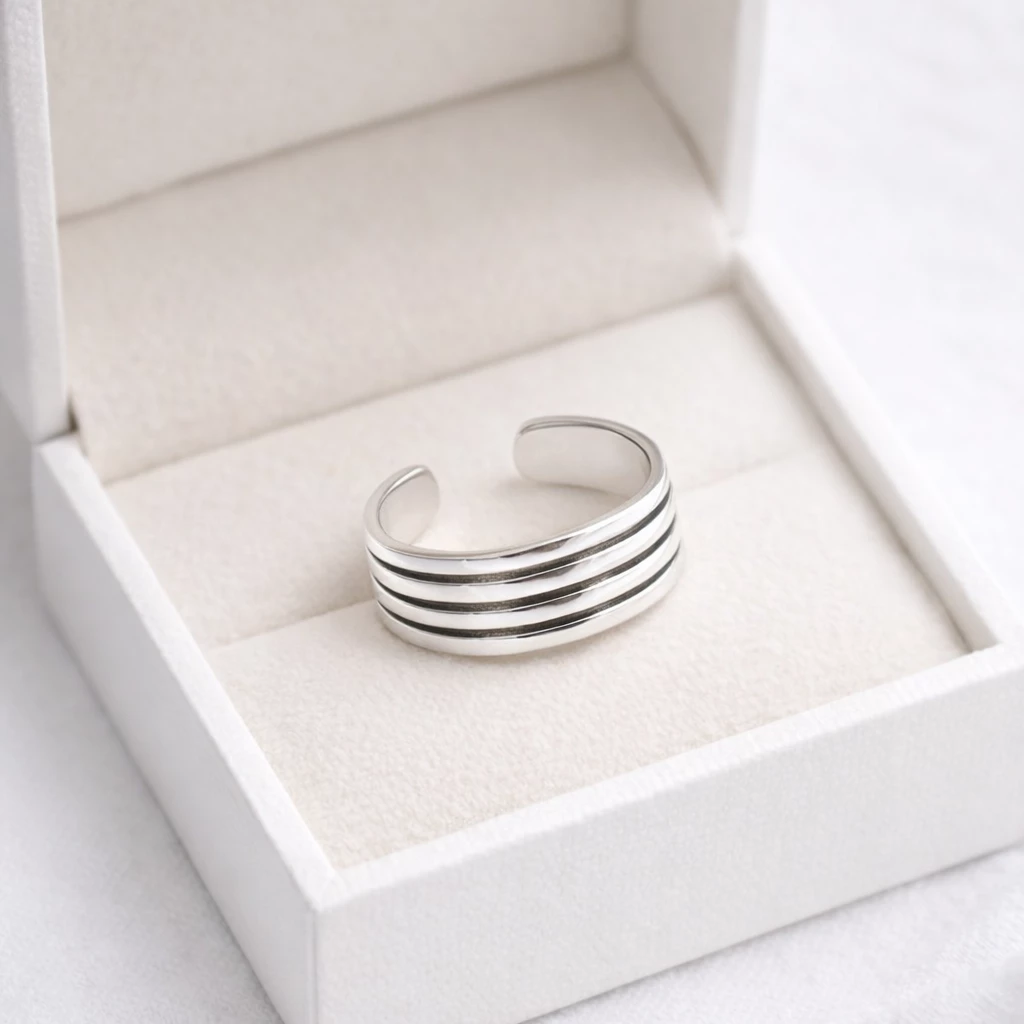Stříbrný prsten na nohu Elviera je elegantní šperk ze Stříbra Ag 925/1000 s jemnými liniemi a patinovaným povrchem, který zvýrazňuje jeho design.