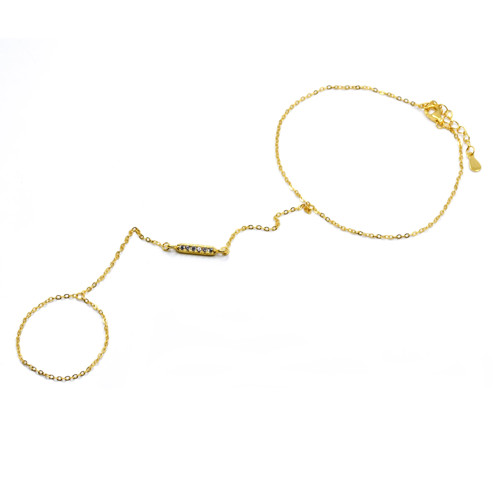 Náramek zdobí podlouhlý přívěsek se závěsem na prst, který je ozdobený třpytivými zirkony. Je dokonalým doplňkem pro každou ženu, která chce podtrhnout svoji ženskost a elaganci. Vyberte si tento nádherný šperk a buďte středem pozornosti při každé příležitosti. Zapínán je na karabinku.