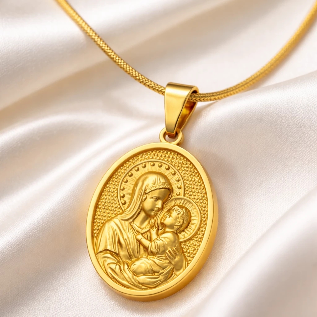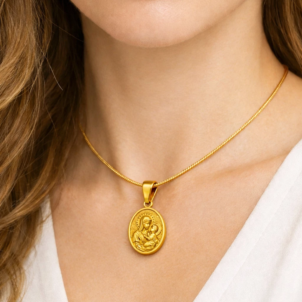 Ocelový zlacený přívěsek Madonka s dítětem je elegantní medailon s jemným reliéfem a hlubokou symbolikou. Nadčasový šperk, který se hodí pro každodenní nošení i jako osobní dárek.