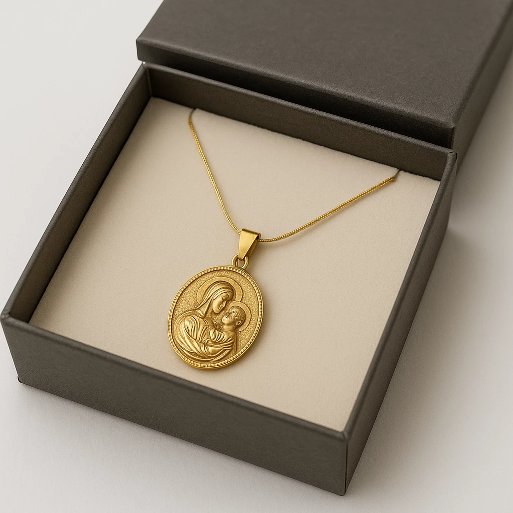 Madonka s dítětem je oblíbeným duchovním symbolem ochrany, víry a lásky – ideální jako osobní talisman nebo jako smysluplný dárek ke křtinám, biřmování, narozeninám či významným životním událostem.