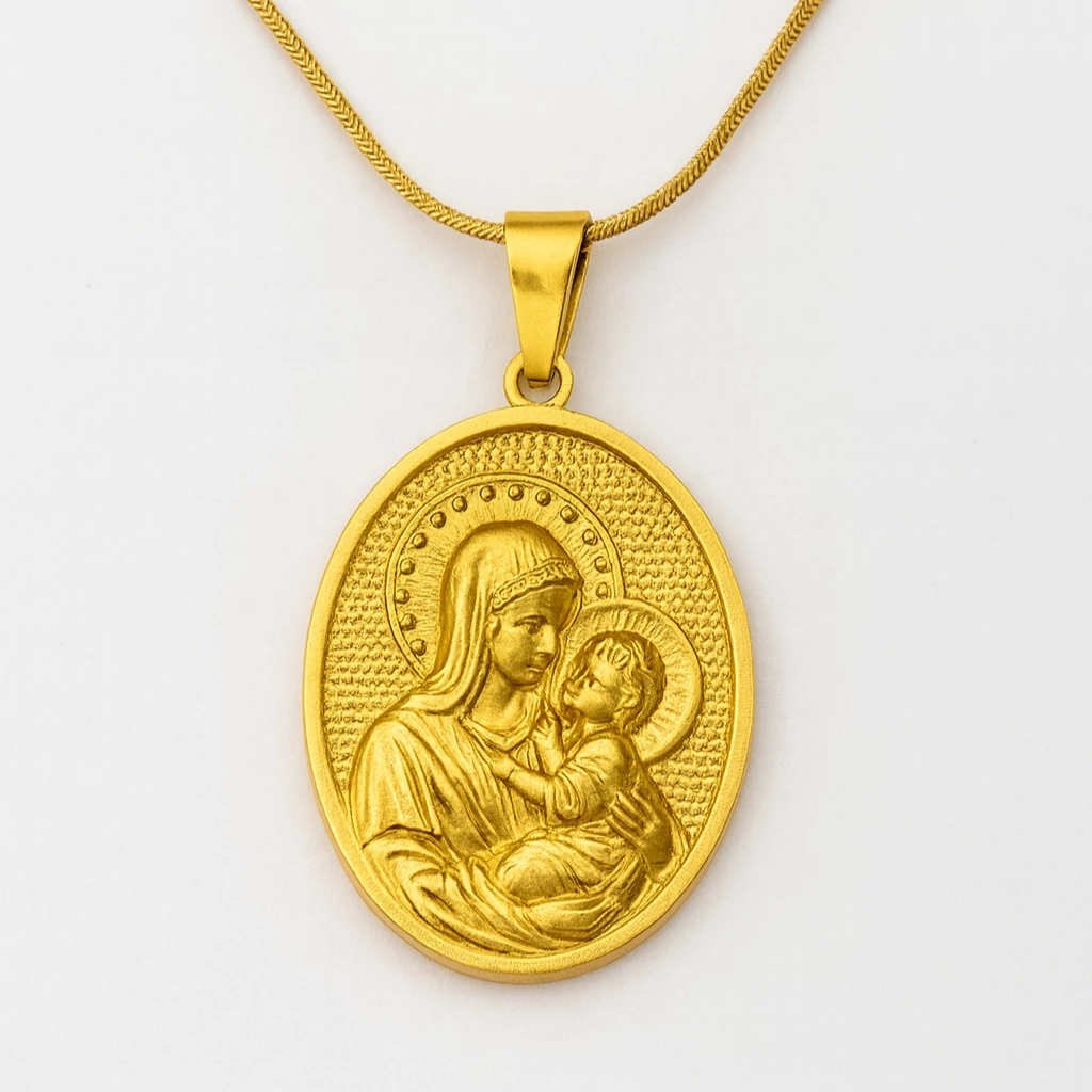 Elegantní ocelový přívěsek s motivem Madonky a dítěte ve zlatém tónu zaujme jemným reliéfem a nadčasovým duchovním významem. Symbol ochrany, lásky a víry, který je vhodný pro každodenní nošení i jako výjimečný dárek.