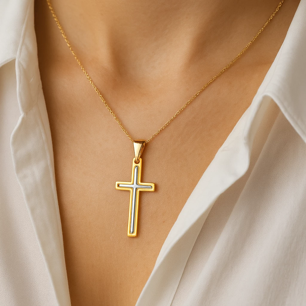 Krásný zlatý křížek v podobě přívěsku na krk. Vhodné pro každého - muže i ženy pro jejich ochranu. Oslní vás jeho originální detaily.