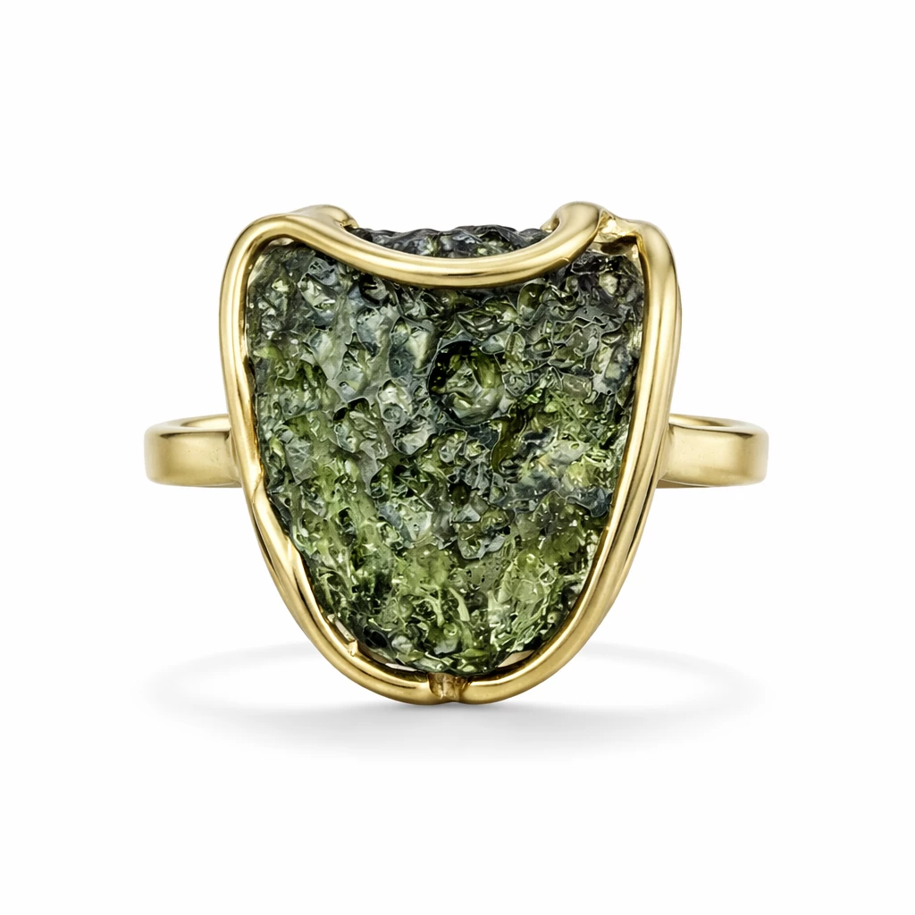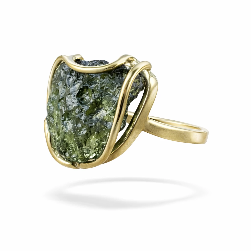 Originální surový prsten osazený kamenem přírodního zeleného vltavínu, který je nádherně uložen do zlatého chlívku.